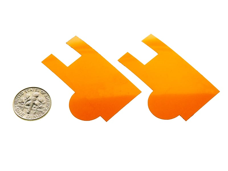 複数の加工をポリイミドフィルムに適用することができます。材料を動かしたり再固定したりする必要はありません。画像の例は、複数の加工を組み合わせた例(四角や丸の形にカットし、Kapton®ポリイミドフィルムとDLMP技術を使用して細かいディテールをマーキング)を示しています。